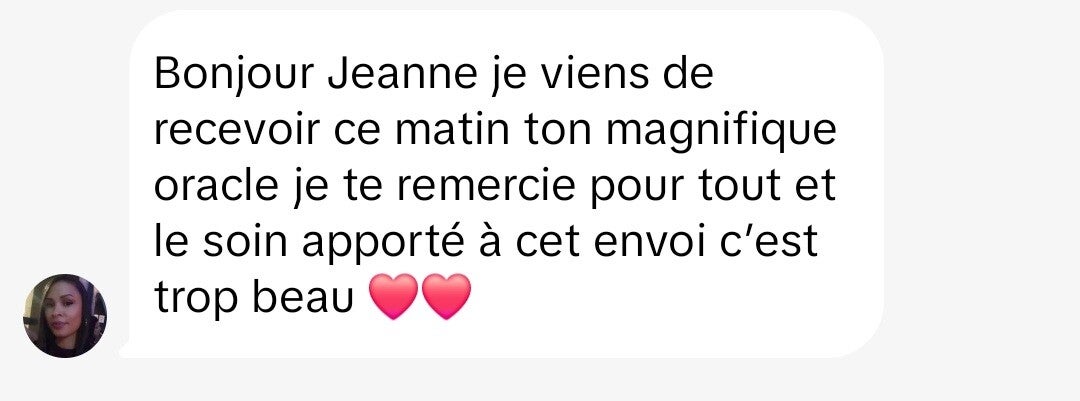 Bonjour ma Jeanne juste un petit mot pour te dire a quel point ton nouvel oracle et magnifique et magique. Et aussi pour te dire que je suis tellement heureuse d'avoir fais ta connaissance. Tu es une personne magnifique tu as une très belle âme et je te soutiendrai jusqu'au bout. A quand le prochain auracle?